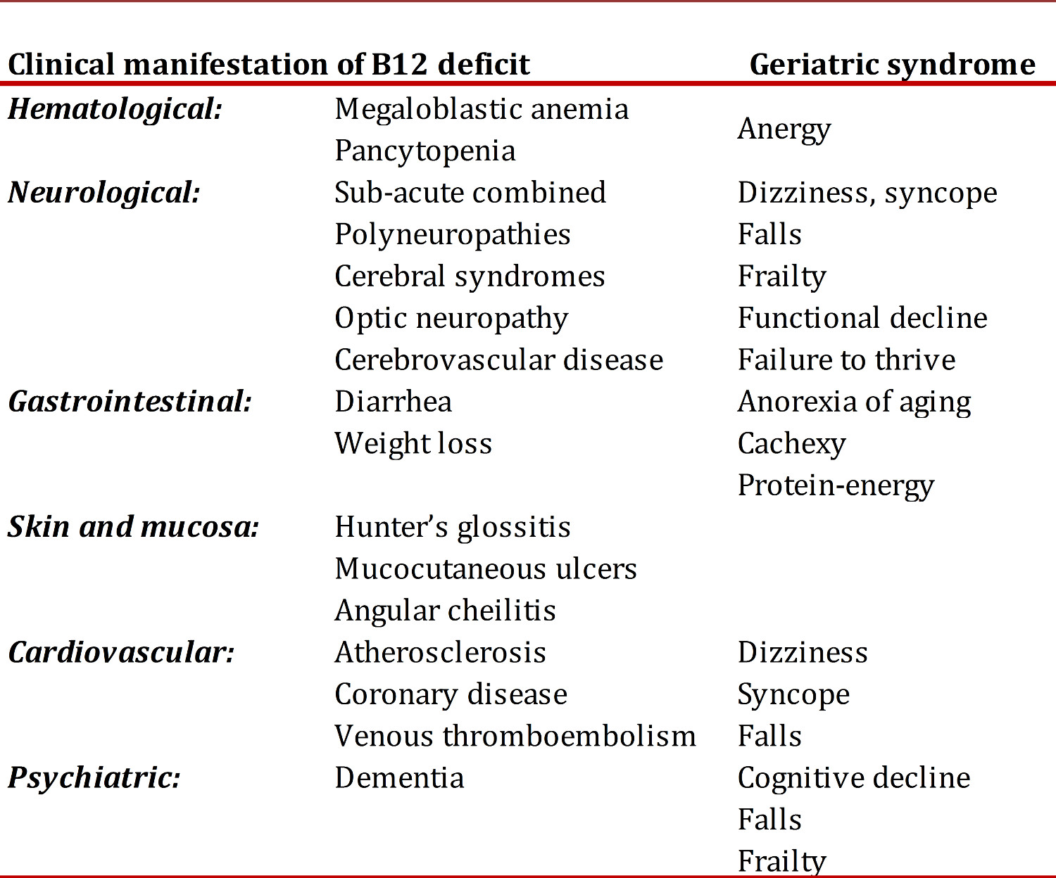 Cyanocobalamin deficiency can have complex clinical manifestations due to compromise in multiple organic systems and can be associated to the development of different geriatric syndromes (Table 2).
