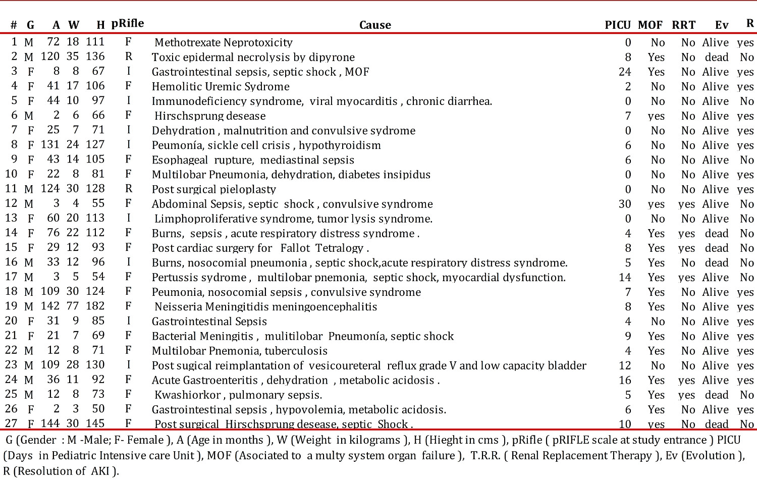 Data from the patients detected is summarized in Table 2, in the order in which they entered the study. A total of 52% were females, mean age was 54.22 months. The diagnoses were taken as they were reported in the clinical history.Some 55.6% presented AKI during hospitalization. Upon diagnosis, 63% of the patients were in the pICU, 18.5% in the emergency service, and 18.5% in hospitalization wards.