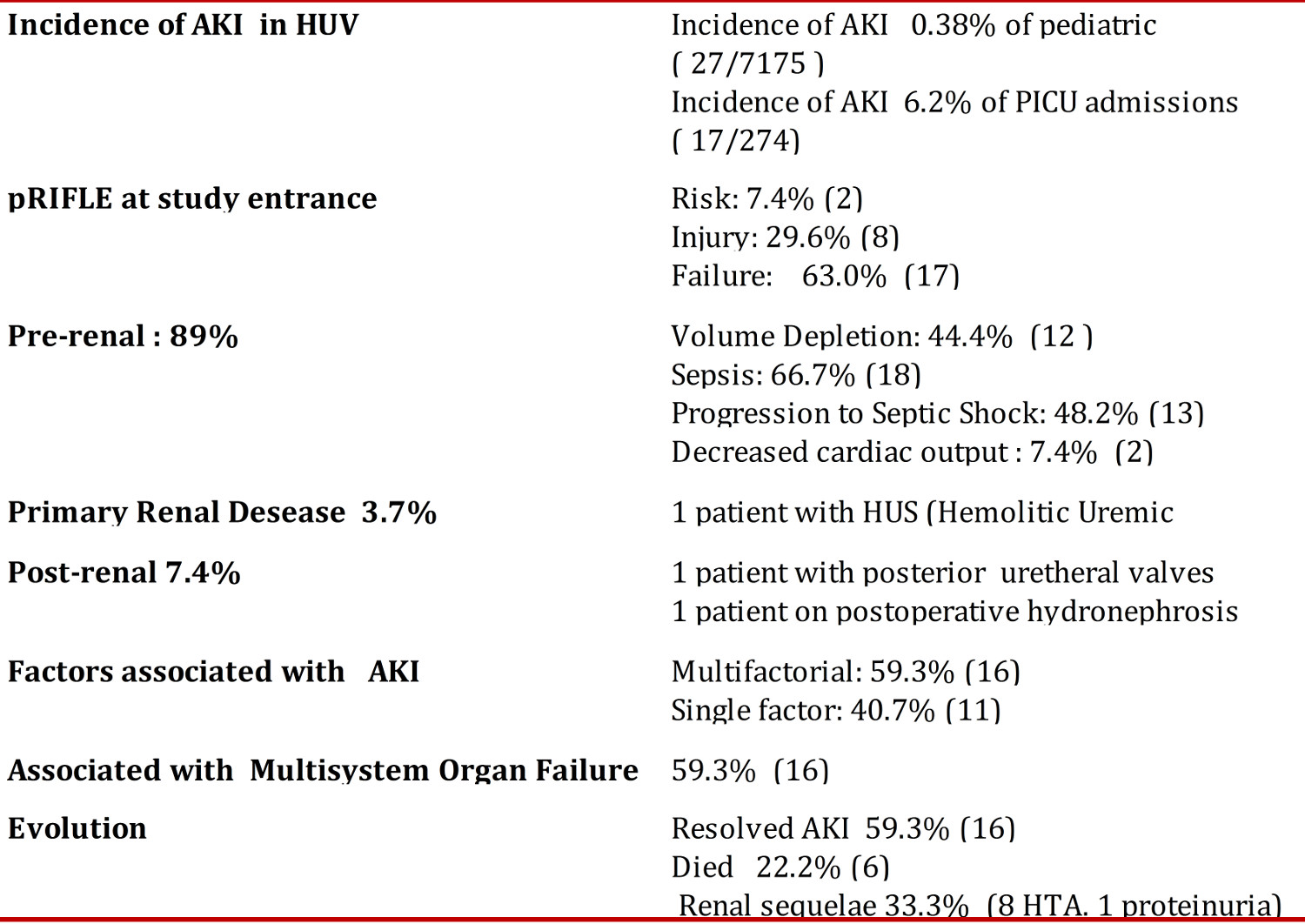In this study, epidemiological surveillance of AKI was conducted in the Pediatric services at HUV applying the pRIFLE Scale. The strength of this study lies in that the epidemiological surveillance was not limited to the unit of pediatric care, like most studies, but that it took place in all pediatric services, permitting us to know the magnitude of this pathology in this reference hospital center (Table 3).