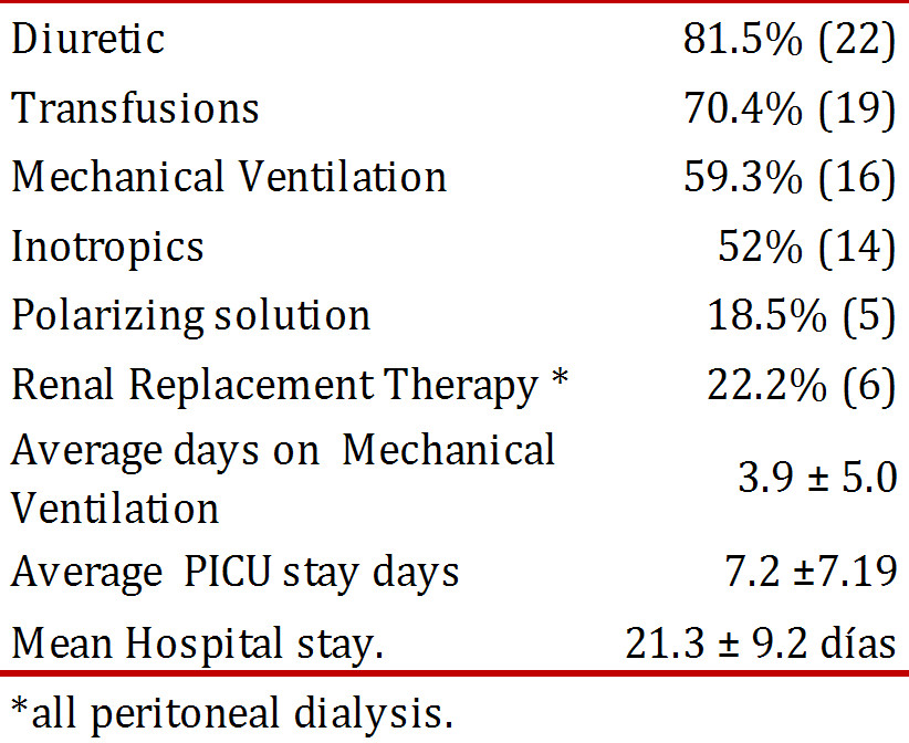 The average hospital stay was of 21.3 ± 9.2 days and the average stay in the pICU was of 7.2 ± 7.19, which evidences the critical state and the costs implied of patients with AKI.