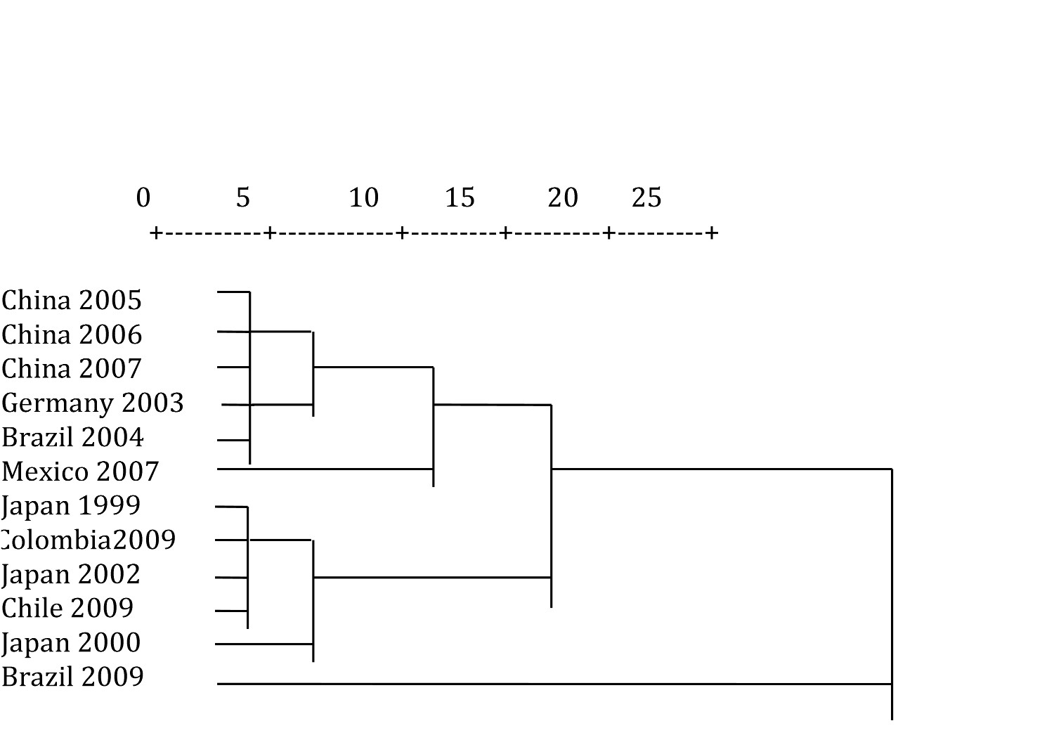 The dendrogram shows the populations considered in the studies in China 2005 23 , China 2006 25 , and China 2007 26 are part of the first cluster from the frequency of FimA II and FimA IV, which indicates that the distribution of these genotypes is similar in these studies. Germany 2003 27 and Brazil 2004 29 make up the second cluster; Mexico 2007 30 is part of the third cluster; Japan 1999 7 , Colombia 2009 31 , Japan 2002 9 , and Chile 2009 comprise the fourth cluster; Japan 2000 20 the fifth and Brazil 2009 12 the sixth cluster. These groupings into clusters show the affinity in the results of the studies conducted in the countries that are included in each of the six previously mentioned.