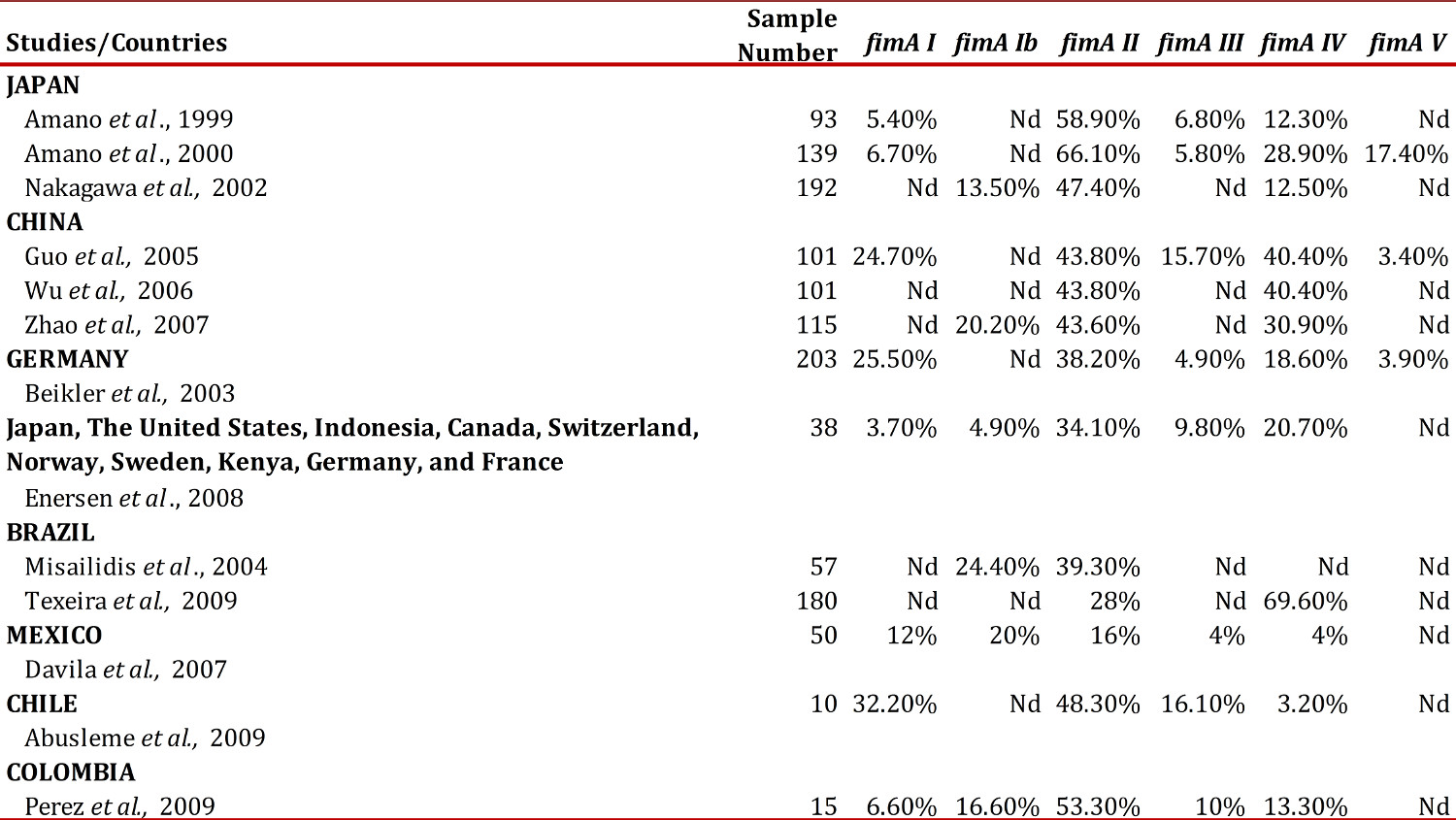 Also, Enersen et al. in 2008 16 , carried out a study of FimA prevalence in 38 samples of patients with periodontitis from various countries like Japan, the United States, Indonesia, Canada, Switzerland, Norway, Sweden, Kenya, Germany, and France; 28 isolates from Finland and 13 isolates from Holland. The distribution of the genotypes was FimA II (34.1%), FimA IV (20.7%), FimA III (9.8%), FimA Ib (4.9%), and FimA I (3.7%). The FimA V genotype was only detected in one isolate.