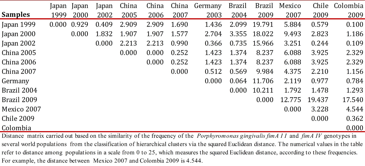 Due to this, this report used the SPSS software ver. 17.0 in English to create a distance matrix (Table 2) based on the frequency similarity of FimA II and FimA IV in several world populations from the classification of hierarchical clusters through the squared Euclidean distance. In addition, the respective dendrogram was obtained (Figure 3) by using Ward's method 32 in which the elements to be related are clustered hierarchically, according to their similarity to evidence the levels of proximity among the populations included in the matrix.