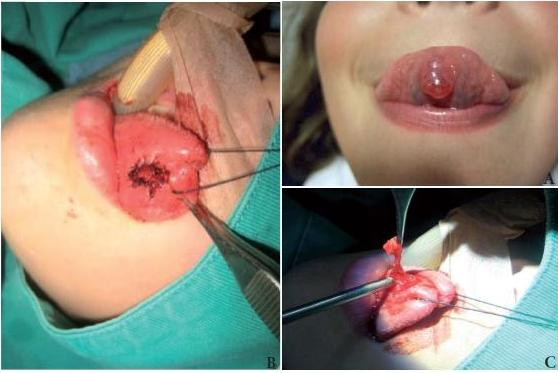 Herein, we present a female 10-year-old patient who consulted for a condition with three weeks of evolution of a midline lesion of the tongue ventral surface, characterized as a cystic, sessile, reddish mass, of progressive growth, associated to occasional pain Fig. 1 (A), which six months back had been operated at another institution with diagnosis of mucocele, with later reappearance of such. Because of the recurrence, the patient was taken to surgery. Under general anesthesia, complete resection was performed of the mass with marsupialization Fig. 1 (B and C). The pathology reported changes compatible with extravasation-type mucocele of the ventral surface of the tongue, which because of its location and presentation corresponds to a mucocele of the Blandin Nuhn glands. The patient continued with out-patient follow up for 10 months without clinical evidence of recurrence.