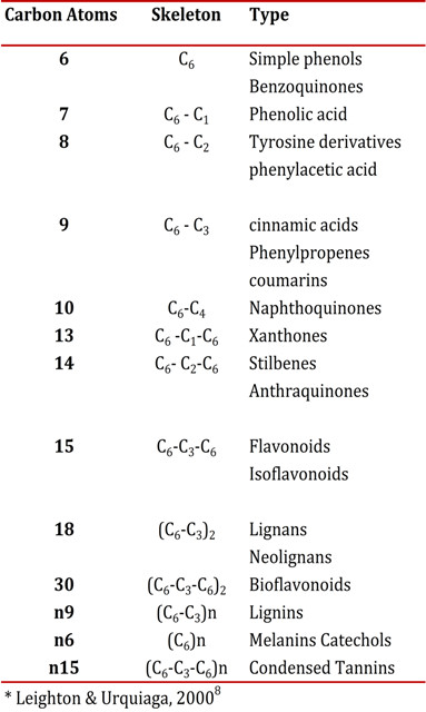 Polyphenols (PFs) are a heterogenous group of chemical substances found in plants, which are characterized by the presence of an aromatic ring with hydroxyl groups, including esters and glycosides 7 . PFs are classified according to the number of carbons and phenol rings; also by the type and number of structural elements connected to the molecule (Table 1) 8 . Historically, some were considered anti-nutrients because they had the peculiarity of precipitating macromolecules such as proteins, carbohydrates and digestive enzymes, and reducing the digestibility of some foods. However, in the decade of the nineties there was increased interest in PFs for their possibly beneficial health effects. Beneficial effects were proposed for cardiovascular 9 or neurodegenerative diseases 10 and in the prevention and treatment of cancer 11 , and, in general, in those diseases in which oxidative stress might play an important role. These beneficial effects are mainly explained by the antioxidant, anti-inflammatory 12 anti-cancerous 13 properties of the PFs.