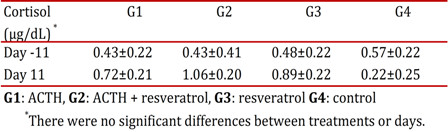 From the results obtained, no significant differences in the concentrations of the cortisol, regarding the day and treatment (p> 0.05) (Table 2) were found.