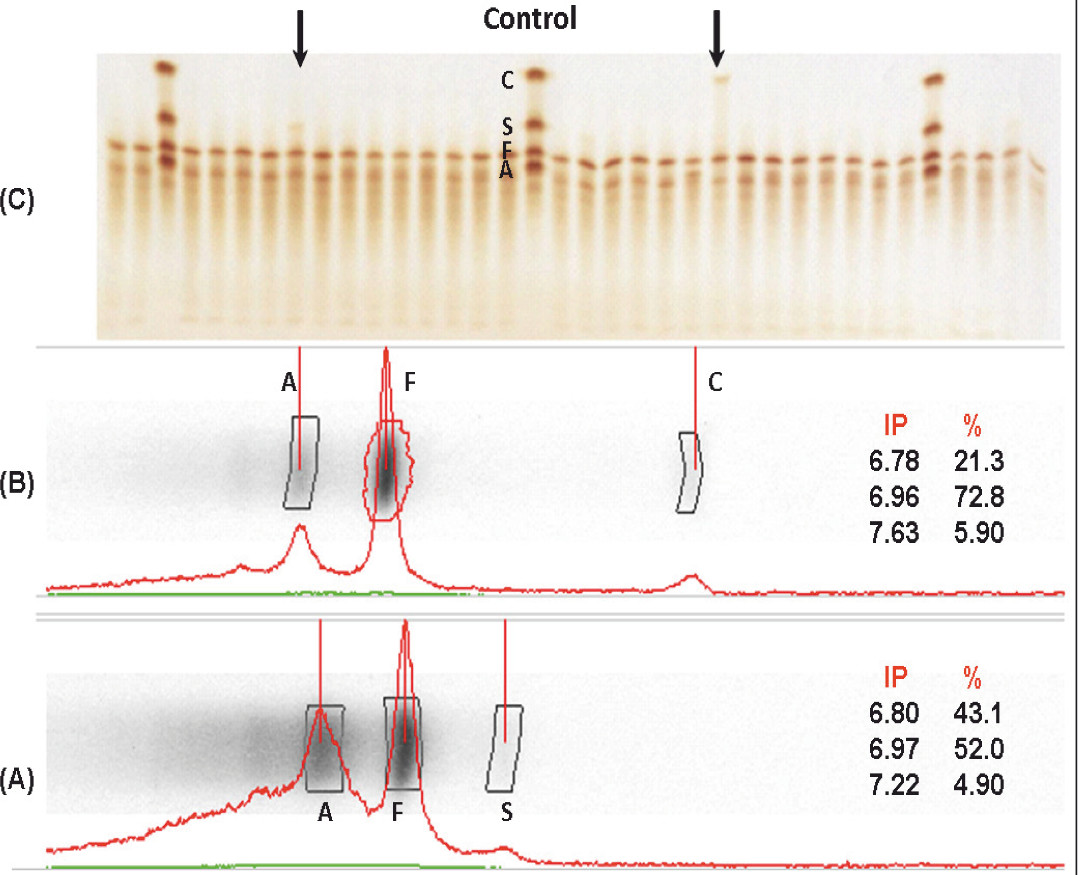 A total of 1729 samples obtained from umbilical cord were analyzed, of which 44.7% (773) were females, 51.2% (886) were males and 4% (70) no data record of the gender. 94.4% of the samples showed a normal pattern of hemoglobin (HbFA), 4.5% corresponded to the sickle cell trait (HbFAS), 1% of the samples showed the trait for hemoglobin C (HbFAC) and 0.1% were double heterozygous SC (HbFSC), for an incidence of 5.6% hemoglobinopathies. Figure 1 shows densitometric analysis of two positive cases, one for Hb AS and one for Hb AC; while in Figure 2 shows densitometric analysis of the positive case for hemoglobin ASC.
