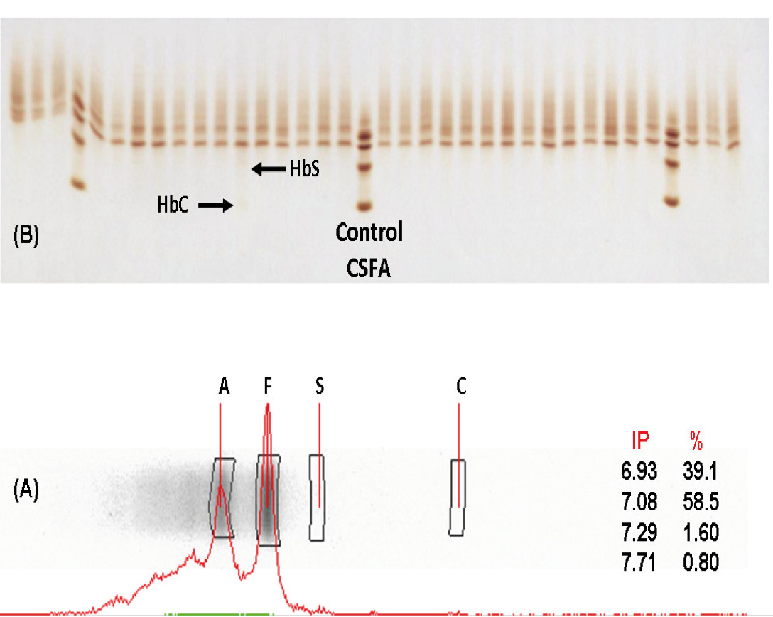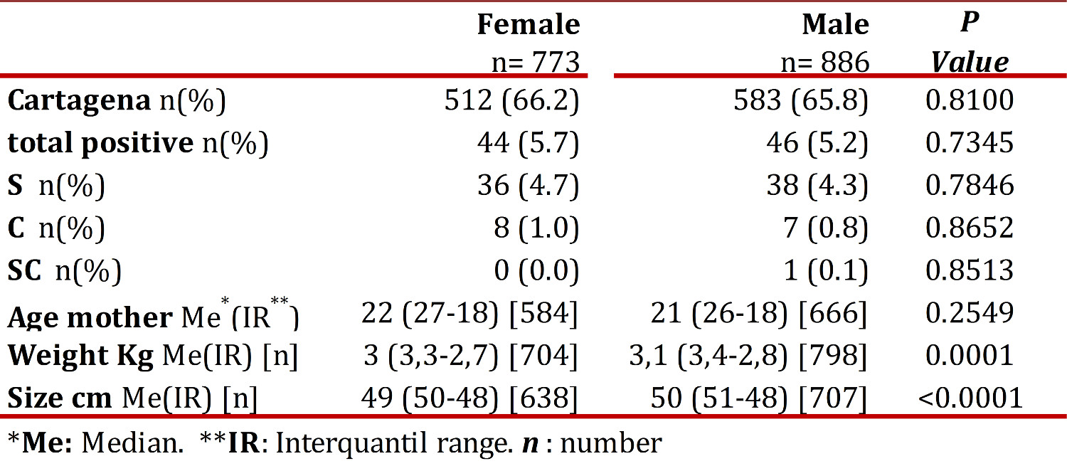 For sample processing, was used the technique of the isoelectric focusing electrophoresis (IEF), in which the separation of hemoglobin was performed by loading a blood sample on an agarose gel containing ampholytes with a pH between 6 and 8 and quantified by densitometry. Was used a pool of blood as a quality control provided by ROPSOHN THERAPEUTICS LTDA, containing hemoglobin F, A, S and C. The IEF technique has a high sensitivity and precision, allowing analyzing a large number of samples,achieving to detect all hemoglobinopathiesof clinical significance. For statistical analysis of data was used EPI-INFO software version 3.5.1 and Excel-2007. Nonparametric variables were analyzed with the Mann-Whitney test.