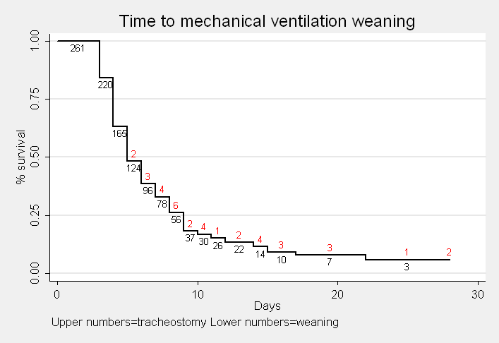 Results: 163 (62%) were male, and the median age was 59±17 years. Almost one-third (36%) of patients required mechanical ventilation longer than 7 days. The variables strongly associated with prolonged mechanical ventilation were: age (HR 0.97 (95% CI 0.96-0.99); diagnosis of surgical emergency in a patient with a medical condition (HR 3.68 (95% CI 1.62-8.35), diagnosis of surgical condition-non emergency (HR 8.17 (95% CI 2.12-31.3); diagnosis of non-surgical-medical condition (HR 5.26 (95% CI 1.85-14.9); APACHE II (HR 0.91 (95% CI 0.85-0.97) and SAPS II score (HR 1.04 (95% CI 1.00-1.09) The area under ROC curve used for prediction was 0.52. 16% of patients were extubated after day 8 of intubation.