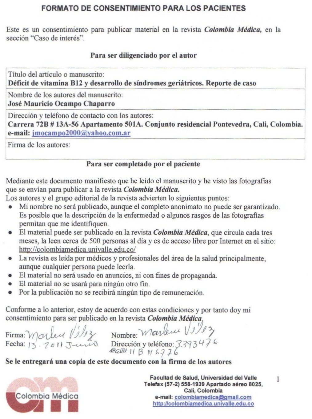 The copy rights of the articles published in Colombia Médica belong to the Universidad del Valle. The contents of the articles that appear in the Journal are exclusively the responsibility of the authors and do not necessarily reflect the opinions of the Editorial Committee of the Journal. It is allowed to reproduce the material published in Colombia Médica without prior authorization for non-commercial use