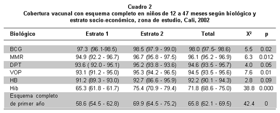 Objetivo: Estimar la prevalencia de vacunación con esquema completo en los niños de 12 a 47 meses de edad de los estratos 1 y 2 de la zona urbana de Cali en el año 2002 según biológicos y las categorías de las variables socio-demográficas de la familia, la madre y del niño.