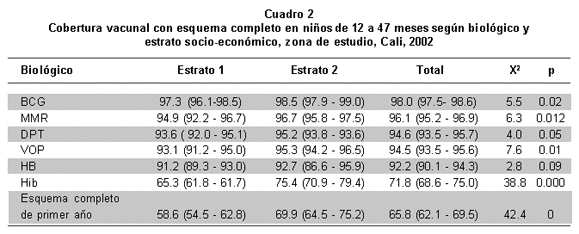 Vacunal cover in children 12 to 47 months old of social and economic 1 and 2 layers in the urban zone of Cali, year 2002.